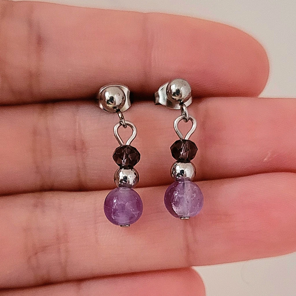 AROS DE ACERO QUIRÚRGICO COLGANTES DE PIEDRA AMATISTA REDONDA X 6 MM. CON CRISTALES Y BOLITAS EN ACERO