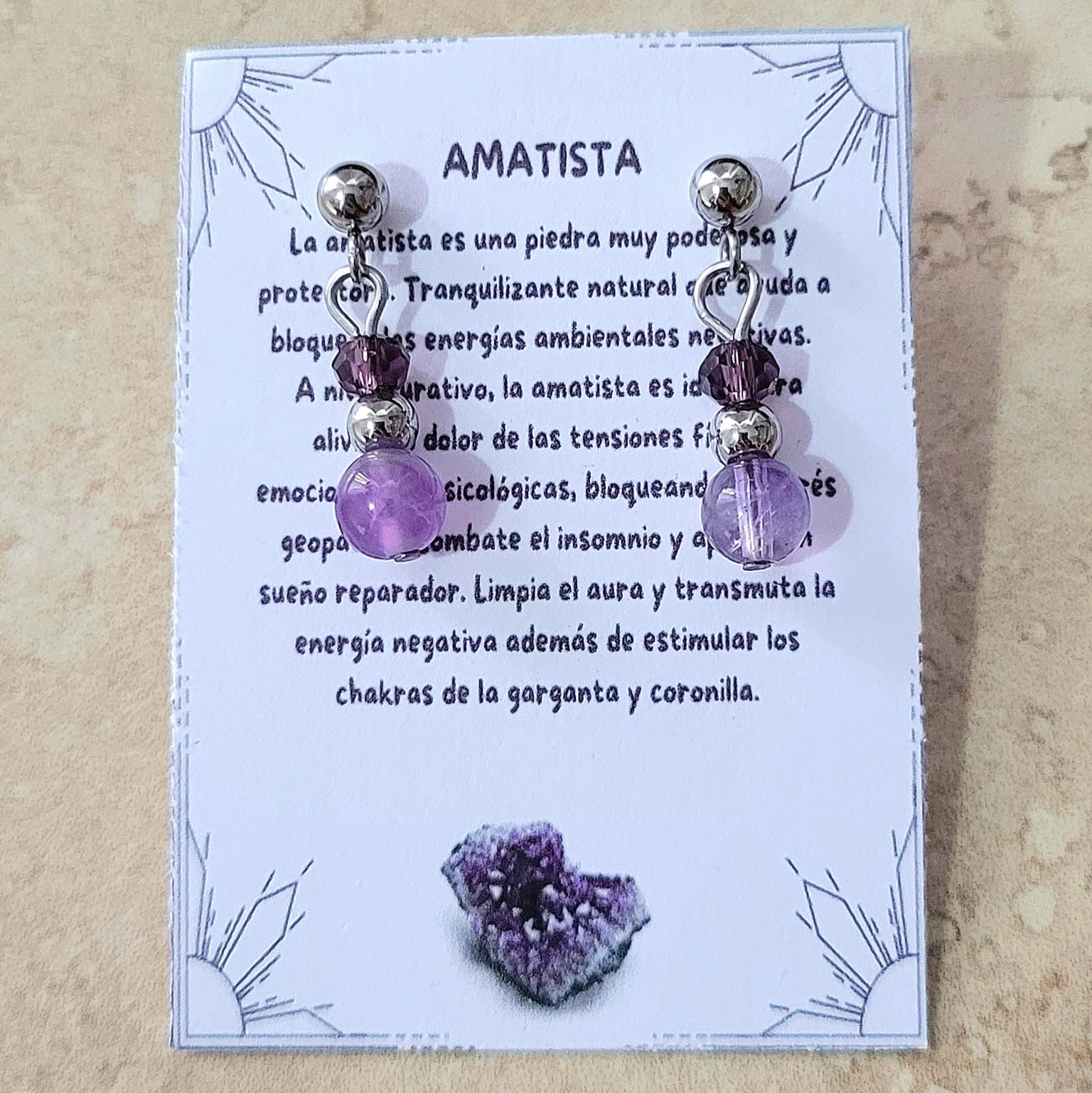 La amatista, conocida por su profundo tono púrpura, es una piedra que ha sido apreciada a lo largo de la historia por su significado esotérico y propiedades curativas. Se cree que aporta calma y serenidad a quien la lleva puesta, promoviendo un estado de equilibrio espiritual y protección contra las energías negativas ya que las transmuta en positivas.