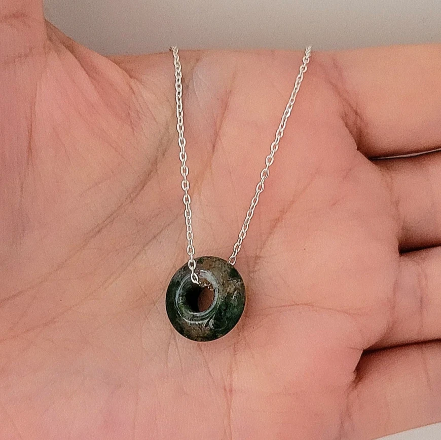 Eleva tu estilo con nuestra Gargantilla de Acero Blanco, confeccionada con precisión y elegancia. Esta hermosa gargantilla mide 45 cm de largo, lo que la hace ideal para cualquier ocasión. El verde suave de la dona de piedra Ágata Musgo agrega un toque de naturalidad y serenidad a tu atuendo. Se cree que el Ágata Musgo tiene propiedades energeticas que favorecen la estabilidad emocional y promueven un sentido de calma.