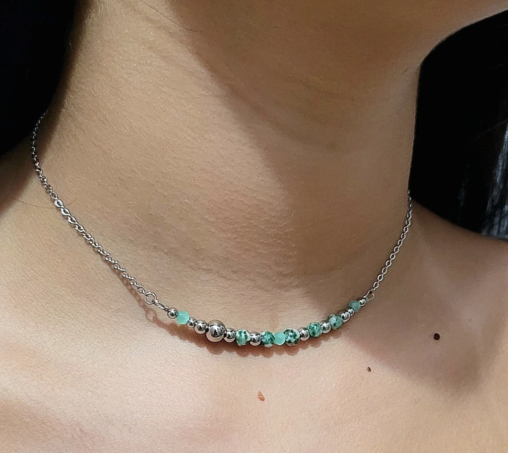 La Gargantilla de Acero Quirúrgico con alargue de piedras Ágata Musgo, cristales y, ofrece un diseño único y elegante. La Ágata Musgo se caracteriza por sus propiedades esotéricas que se cree que aportan equilibrio y armonía a quien la porta.
