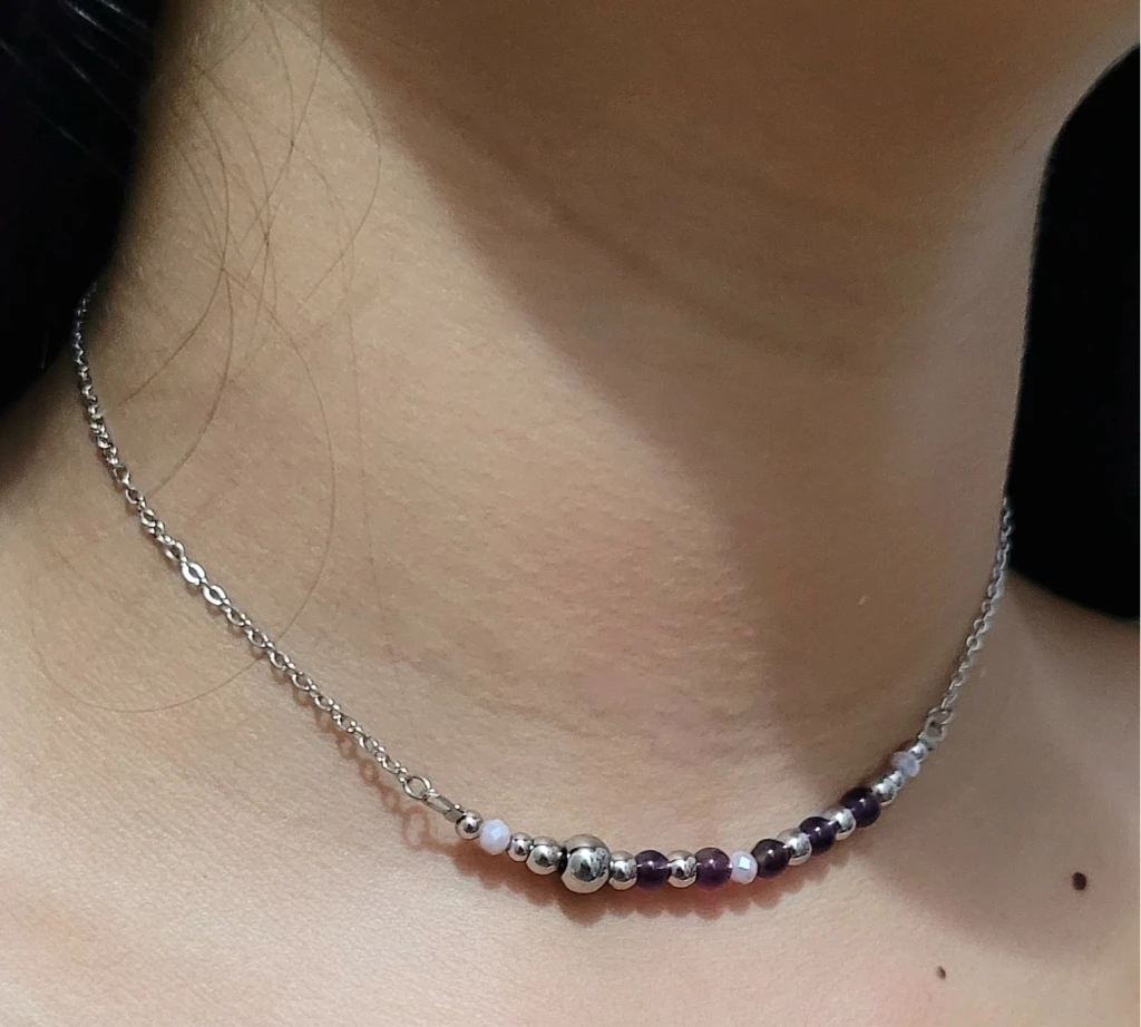 La Gargantilla de Acero Quirúrgico con alargue y cristales de amatista combina la elegancia del acero con las propiedades esotéricas de la amatista. Se cree que la amatista aporta calma, serenidad y protección a quien la lleva puesta.