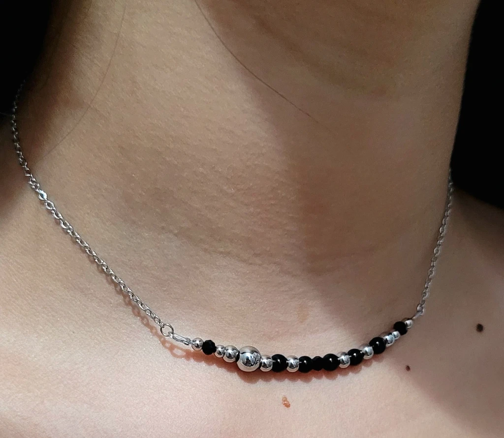 GARGANTILLA DE ACERO QUIRÚRGICO X 35 CMS. MÁS ALARGUE CON PIEDRAS OBSIDIANA, CRISTALES Y BOLITAS DE ACERO