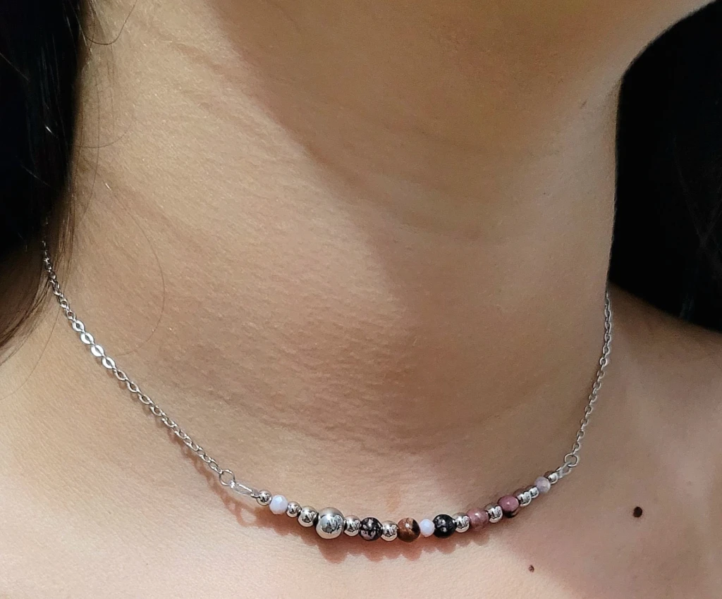 La Rodonita es una piedra conocida por sus propiedades esotéricas que se cree que promueven el equilibrio emocional, la compasión y la conexión con la energía del corazón. Esta gargantilla no solo es una pieza de joyería, sino también un símbolo de armonía y bienestar espiritual.