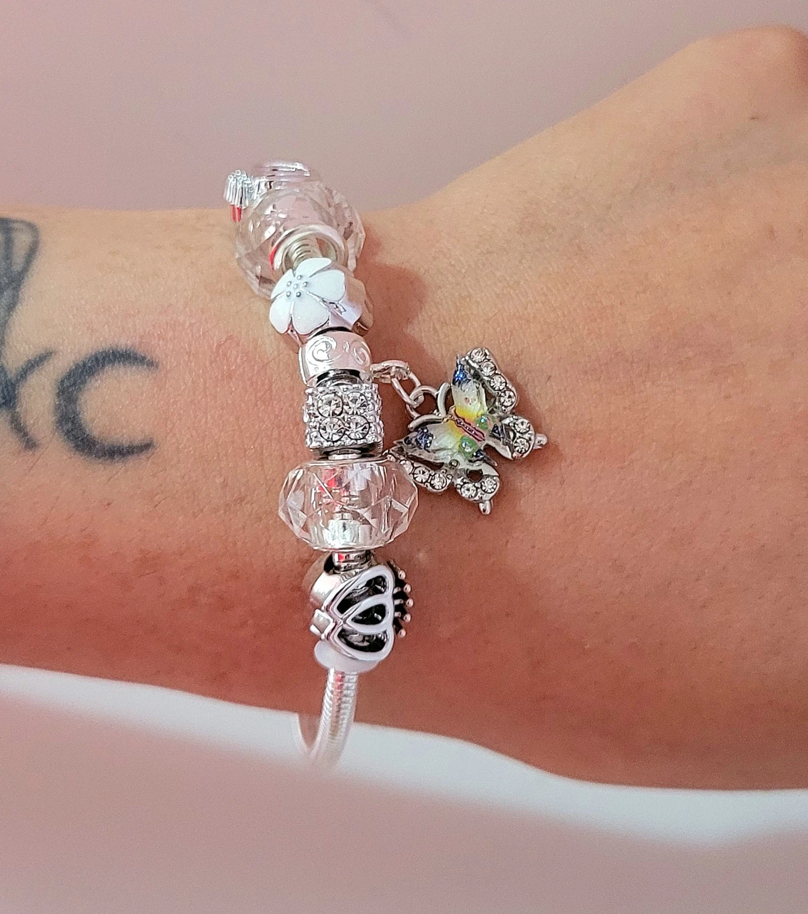 PULSERA DE ACERO BLANCO CLAPTON TIPO PANDORA CON MULTI DIJES BLANCA Y DIJE CENTRO DE MARIPOSA