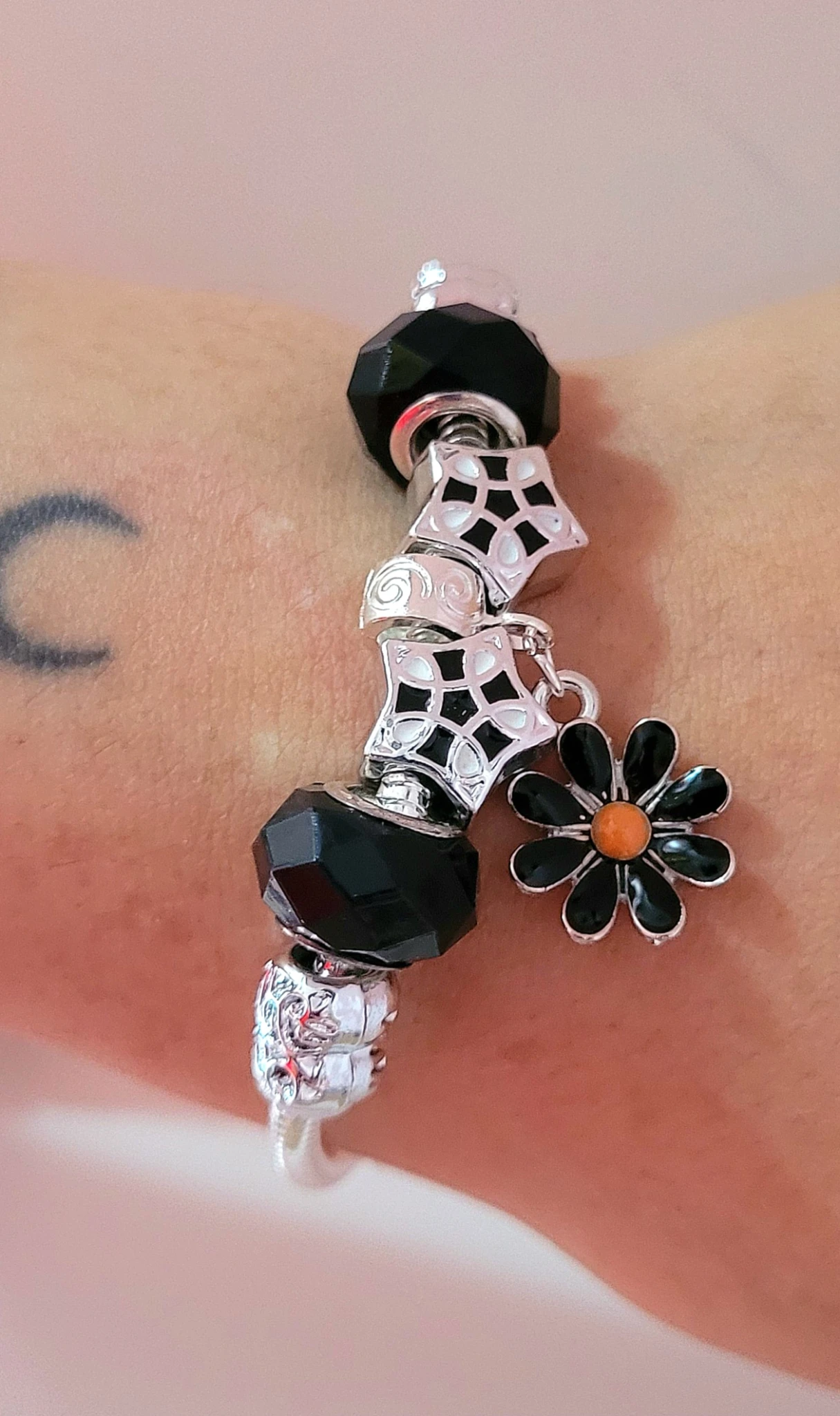 PULSERA DE ACERO BLANCO CLAPTON TIPO PANDORA CON MULTI DIJES NEGRA Y DIJE CENTRO DE FLOR