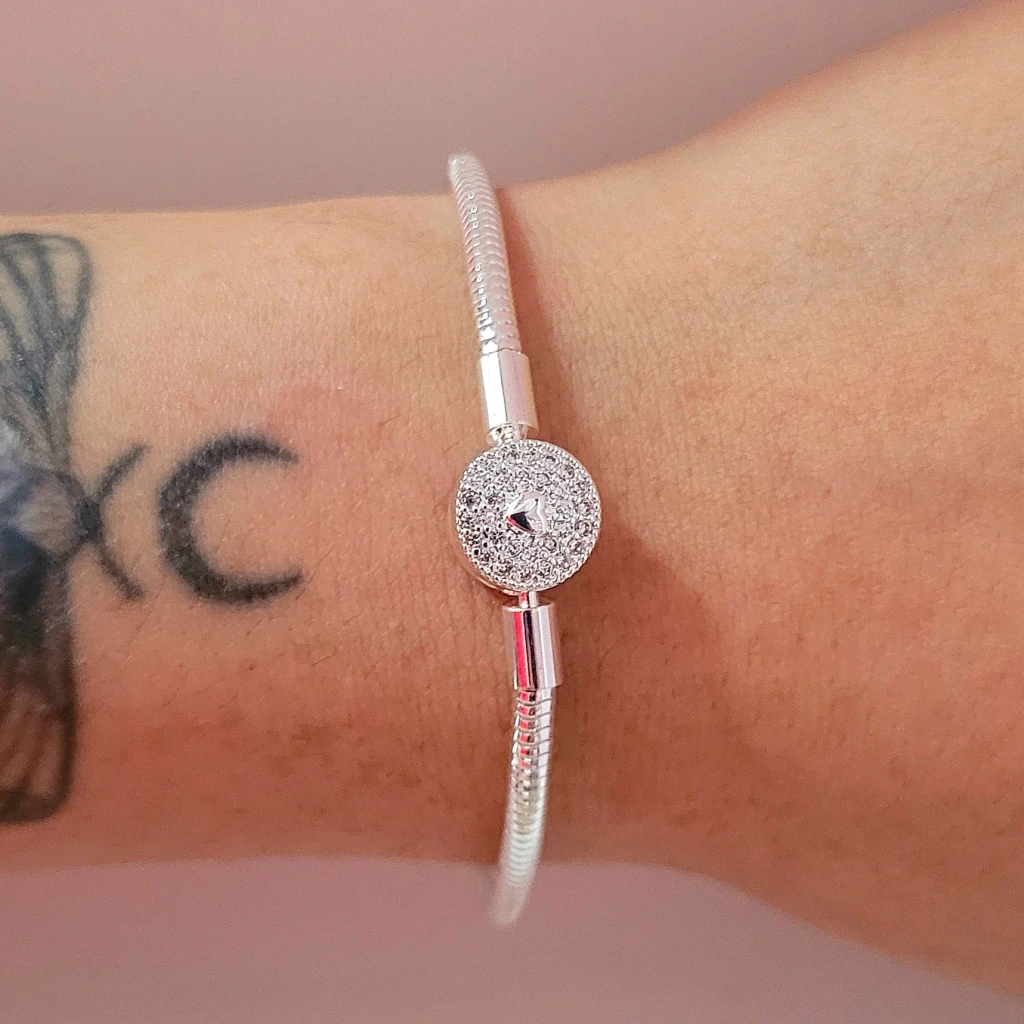 PULSERA DE ACERO BLANCO CON CIERRE TIPO PANDORA DIJE DE CIRCULO Y CORAZÓN CENTRO CON MICROPAVÉ