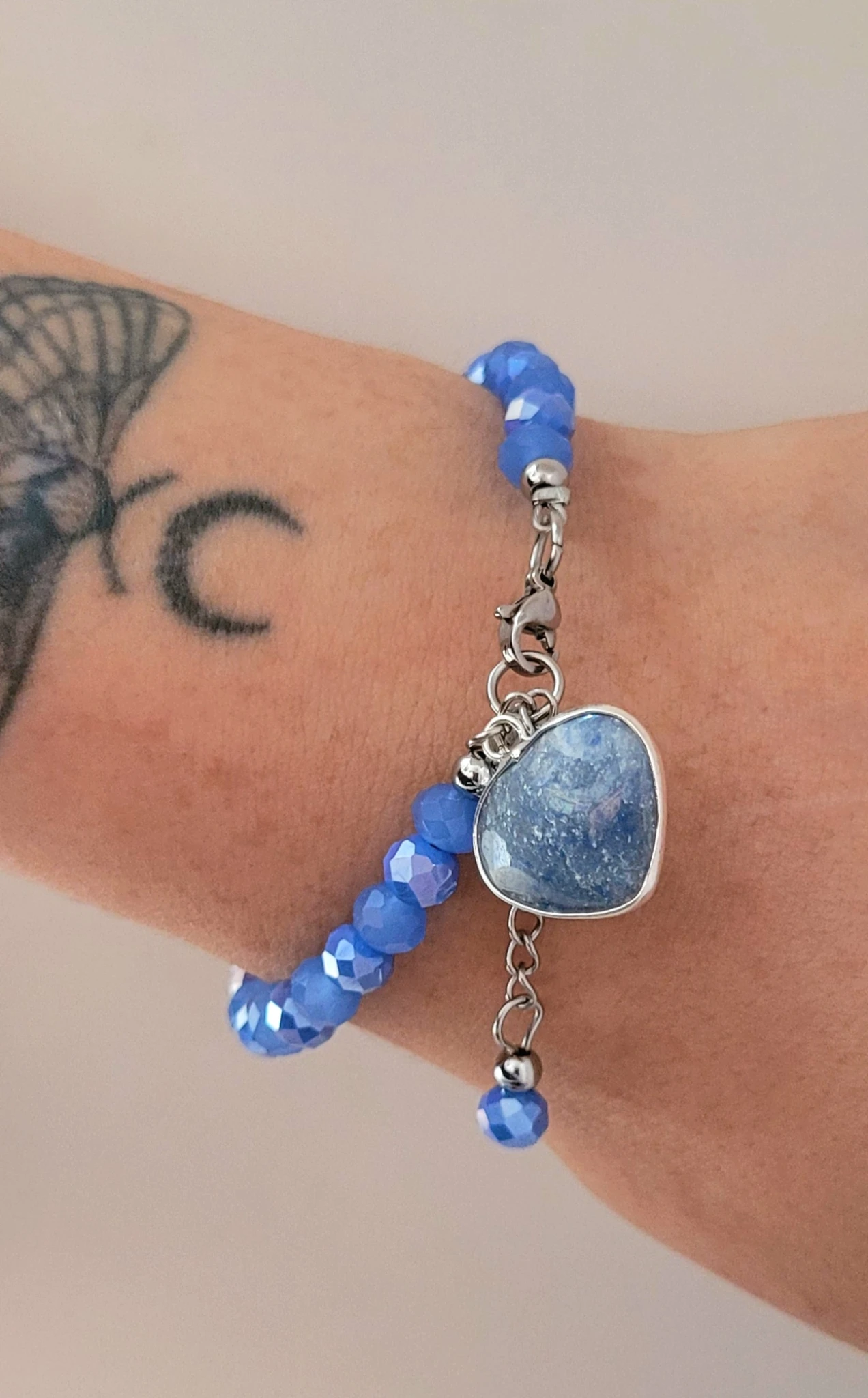 La pulsera de acero quirúrgico con cristales de 6 mm y corazón de piedra cuarzo azul es un accesorio elegante y sofisticado que combina la durabilidad del acero con la belleza de los cristales. El cuarzo azul es una piedra conocida por su calma y serenidad, se cree que ayuda a reducir el estrés y promueve la armonía emocional. La pulsera cuenta con un corazón de cuarzo azul que añade un toque de significado esotérico, simbolizando el amor y la conexión emocional. Además, el alargue permite ajustar el tamaño de la pulsera para adaptarse a diferentes muñecas.